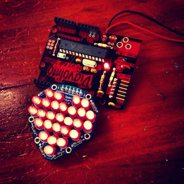 I kväll var jag på Noisebridge, ett hacker-ställe i The Mission, och deltog i Circuit Hacking Monday. Det är en öppen workshop som går ut på att bygga ihop olika elektronikkit. Jag valde att löda ihop Jimmie P Rogers kit Open Heart och koppla det till ett Diavolino kit (som Arduino) från Evil Mad Science.